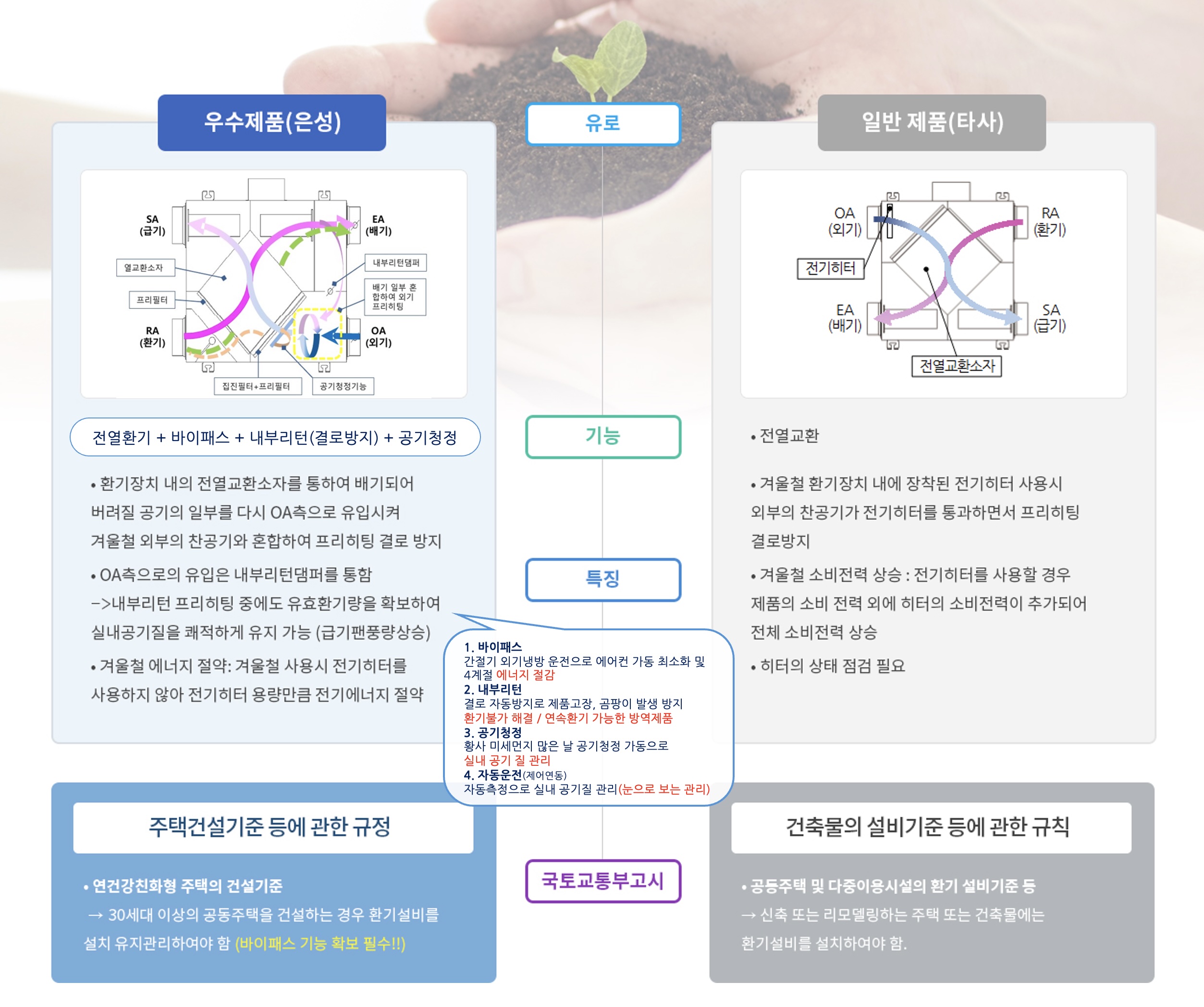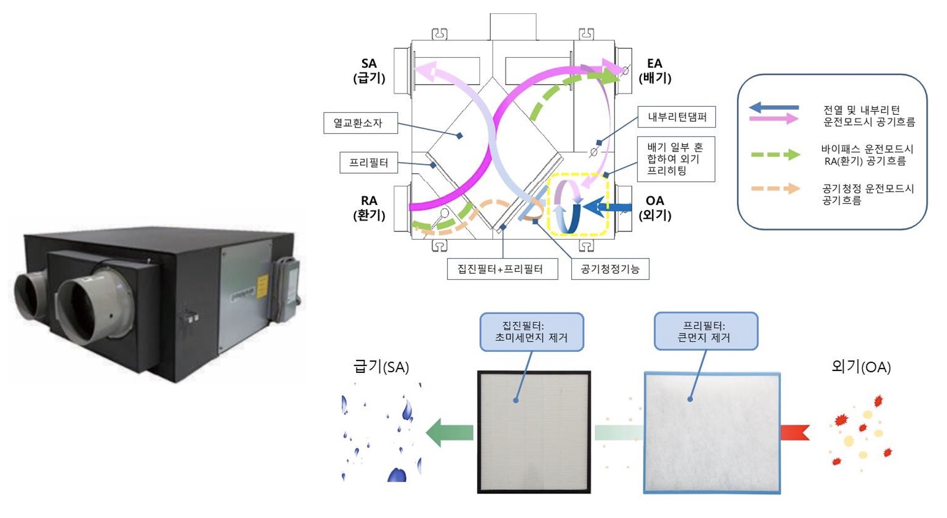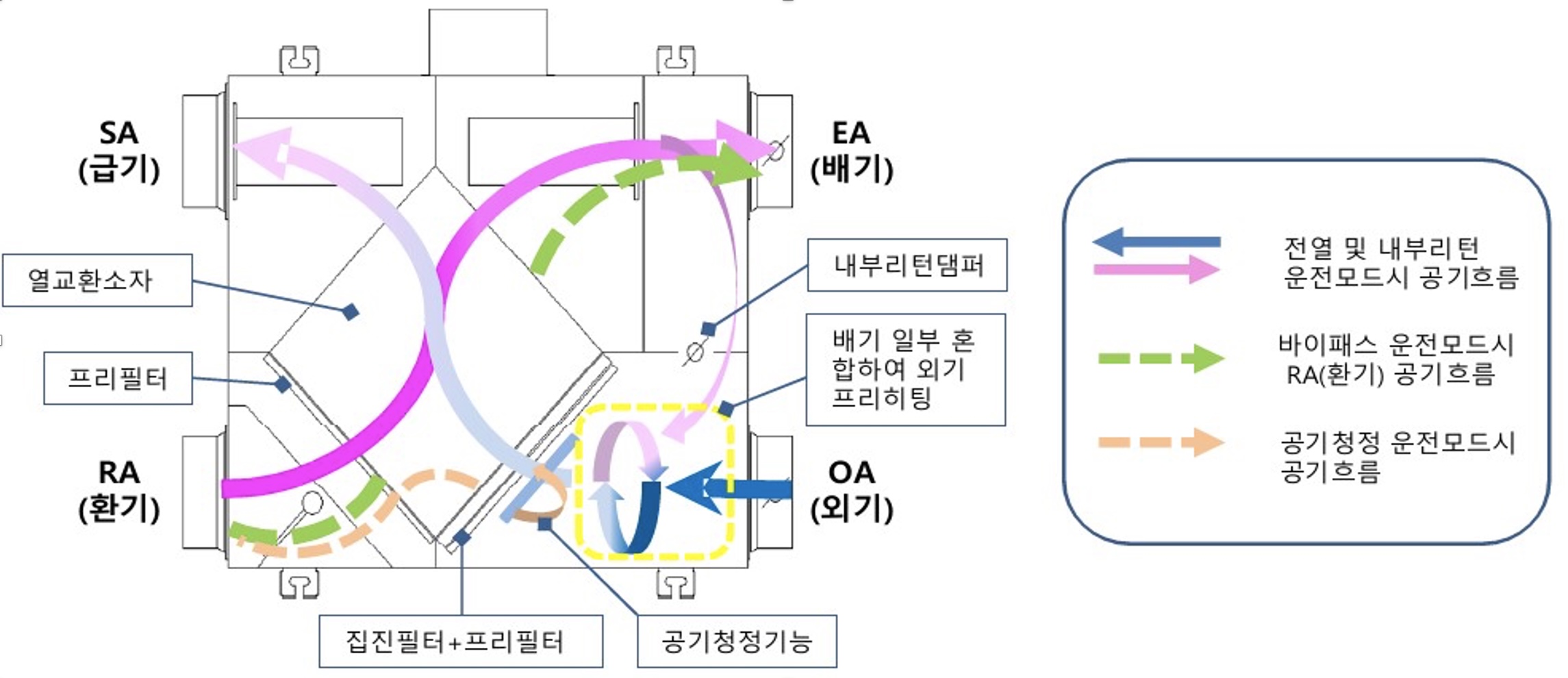 - 바이패스 : 봄·가을 중간기에 외기 냉방 운전으로 에어컨 가동 최소화, 에너지 절약