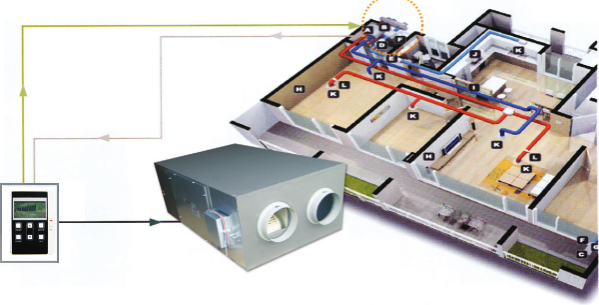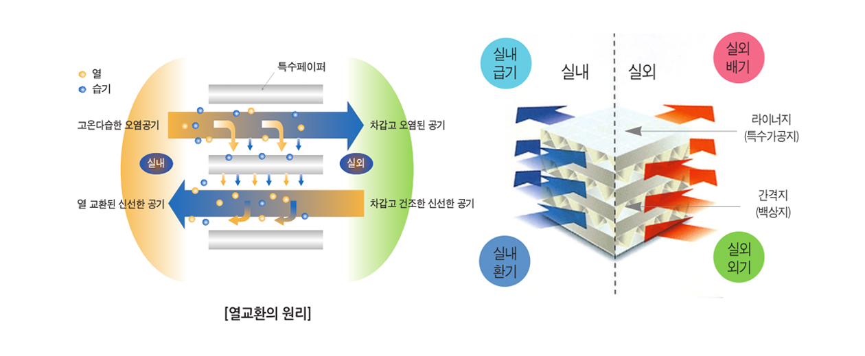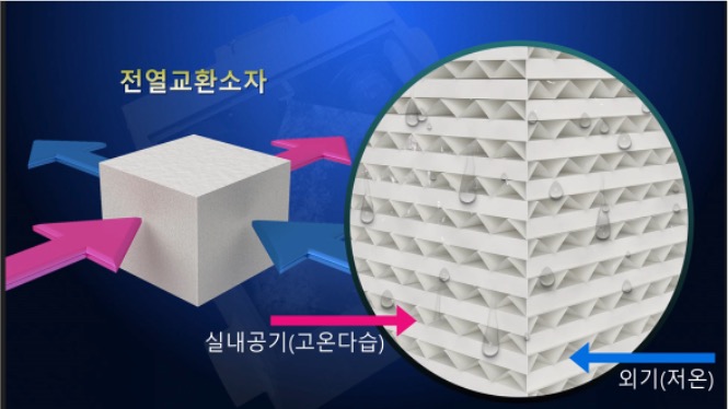 공기 중의 에너지는 높은 곳에서 낮은 곳으로 이동하므로 실내에서 오염된 공기를 배출시킬 때 배출 공기중의 열과 습기(에너지)가 실내로 들어오는 차갑고 건조한 공기쪽으로 이동하여 열 및 습도의 손실이 많이 발생하지 않고, 실내의 오염원이 재 유입되지 않도록 수분만 통과하는 특수 페이퍼로 구성되어진 전열 교환소자를 적용.
