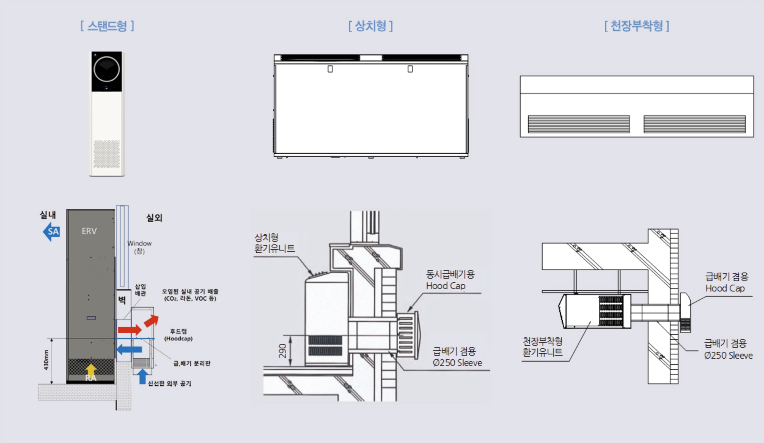 무덕트(스탠드형, 바닥상치형) 천장부착형 환기유니트 설치도